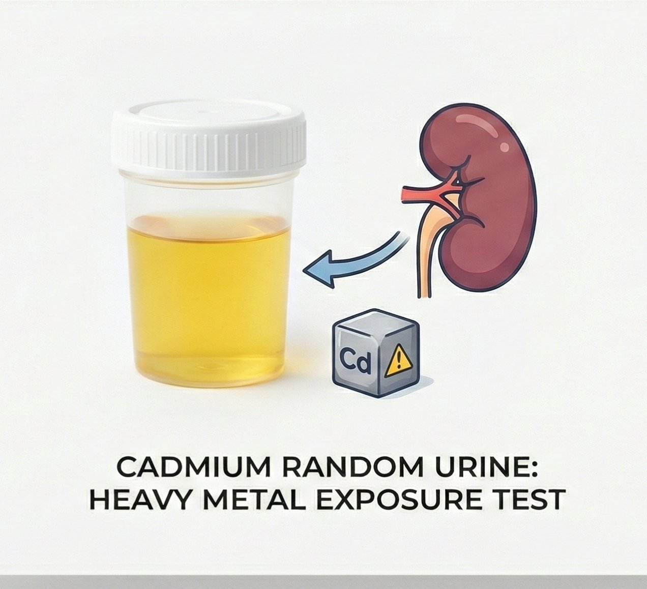 The Cadmium Random Urine Test measures the amount of Cadmium, a harmful heavy metal, present in the urine. Cadmium exposure usually occurs through industrial work environments, batteries, welding fumes, cigarette smoke, contaminated food and water. Long-term exposure can damage the kidneys, lungs, and bones.