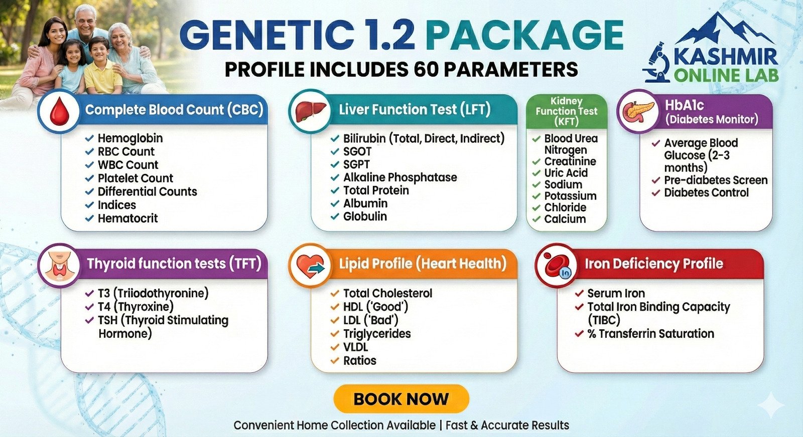 Upgrade your health monitoring with the Kashmir Vital 1.2 Wellness Profile. This comprehensive profile builds upon essential health checks by including a vital screening for diabetes management. With 60 parameters, it offers a deeper insight into your body’s core functions. It is the ideal choice for individuals seeking a thorough evaluation of their heart, liver, kidneys, thyroid, iron levels, and long-term blood sugar control.